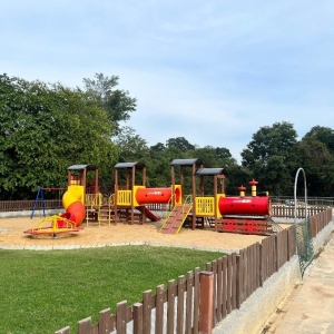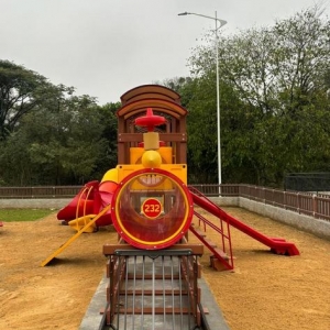 PLAYGROUND TEMÁTICO TREM COM VAGOES , várias cores, ensaio de acordo com a norma ABNT NBR 16071-2012 Estrutura principal com colunas de a carbono redondo 4”x2mm, revestida com metalização apresentando ensaio em tubo de aço fosfatizado conforme norma ABNT 9209:1986, piso em aço carbono metalizado 3mm apresentando ensaio NBR 8094:1983, Material metálico revestido e não revestido corrosão por névoa salina. E secundária com acessórios em aço, tubos redondos de 1”x2mm, 1.1/4”x2mm, 1.1/2”x2mm, 2”x2mm, retangulares de 30 x 50 x 2mm, quadrado de 15x15x2mm, barra maciça de 9 mm, barra chata de 1.1/2”x1/8”mm, tampas externas de plástico, buchas em nylon apresentando ensaio de resistência a condutividade elétrica ASTM D257. Processo de soldagem TIG/MIG, com laudo de ensaio de bordas cortantes ABNT NBR NM300-1-04 e apresentando ensaio de resistência a tração e arrancamento em tubo soldado ABNT NBR ISO 6892-1:2018, e pintura a pó precedida de banhos químicos, apresentando ensaio de espessura da camada de tinta ABNT NBR 10443-2023, ensaio de aderência da camada de tinta ABNT NBR 11003-2023 e análise química para verificação de metais pesados ABNT NBR NM 300-3. Adesivo com material antivandalismo indicando idade e preferência de uso. Placa de alumínio com marca, mês/ano e demais informação do fabricante.