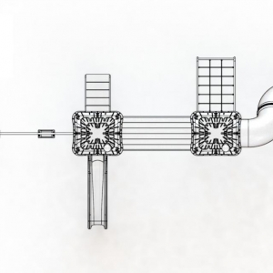 08: Um Tobogã em plástico com duas curvas de 90° parede simples, uma saída de conexão superior e uma ponteira de saída em plástico rotomoldado parede dupla, fixado na plataforma com portal em plástico rotomoldado parede dupla, unidos com parafusos de 3/8” x 3”, duas orelhas de fixação 60 x 35 x 4 mm com furo de 10 mm, fixado ao solo com parabolds galvanizados ou chumbador 3/8” x 3” e na plataforma com parafuso cabeça francesa 5/16” x 5”. Medida mínima aproximada de 3000x800mm;